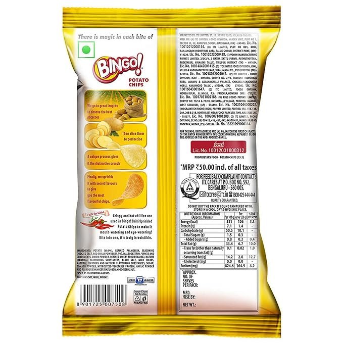 - Size Name: 90 G (Pack Of 1);Material Features: Vegetarian;Ingredients: Ingredients: Potato (55.7%), Refined Palmolein, Seasoning Mix {Iodised Salt, Chilli Powder (1.1%), #Spices & Condiments, Onion, Maltodextrin, Wheat Flour, Milk Solids, Black Salt, Tomato Powder [Tomato Paste, Anticaking Agent (Ins 551)], Refined Sugar, Hydrolyzed Vegetable Protein, Acidity Regulators (Ins 296, Ins 330, Ins 334), Garlic, Anticaking Agent (Ins 551), Flavour Enhancers (Ins 627, Ins 631)} And Iodised Salt. #Used As Natural Flavouring Agent.